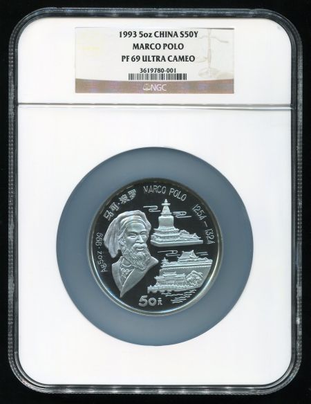 1993年马可波罗5盎司银币一枚(发行量:500枚、NGC PF69)