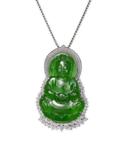 老坑玻璃种观音,此款玉料质地纯净、细腻,无裂无棉,色正、匀又够阳。细腻精准的雕刻工艺,把观音端庄慈祥的相貌刻制得惟妙惟肖。再加上钻石的映衬更是显得富丽堂皇,美不胜收。