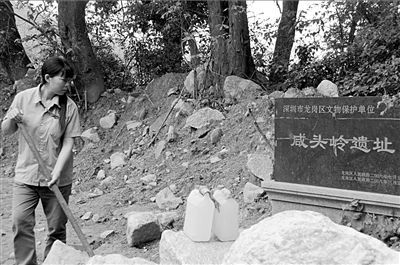 另一文物屋背岭商时期墓葬群遗址,位于在建的南方科技大学新校区内,命运也堪忧:在遗址保护范围内,推土机推出一条条纵横交错的土路,路边被重型机械挖出数十个大坑,多数深达2米,有的大坑里面被抹上水泥,蓄满了水。