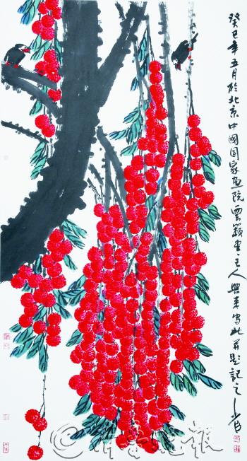邢少臣勤于写生,注重笔墨的书写性,他经常画一些前辈花鸟画家常画的题材,比如松鹤、苍鹰、菊石、荔枝等,一方面借助于这些题材表现人们审美定势中的文人情怀,抒发自己的“胸中逸气”,另一方面也通过这些创作,揣度自己笔墨与前辈画家创作语言之间的不同与距离。他笔下的水鸟憨态可掬,苍鹰犀利顽强,仙鹤毫无修饰,仅在画面的一黑一白间,显现静态中所蕴藏的沉稳与凝重。作品《大利图》中,邢少臣便突出了画面的清爽明豁,古雅清新。在树干的走笔上,凝练老辣,落笔沉厚,重墨、焦墨筑成枝干,荔枝的整体光影处理,不但没有让画面有漂浮俗艳之感,还很好的将物象的“质”与画面的“势”和谐统一起来。这不但强化了笔墨晶莹雅韵的审美特质,突出了写意花鸟画的水墨雕塑性,也验证了写意花鸟画的雕塑性并不是一句口号,而是在笔墨功夫与境界精神的不断升华中,体悟出的大写意花鸟画雕塑性的必然与魅力。