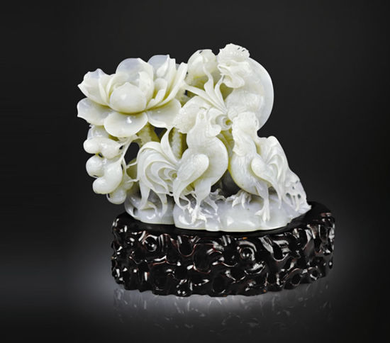 瓯江城成2013年春拍亮相的精美和田籽料白玉雕摆件作品,寓意为官上加官的吉祥图题材玉雕创作, 高度地概括了美好的寓意 、满足人们生活的向往 ,题材合理,形态活泼有趣,花生、莲花的瓣、蕾、枝和雄鸡冠、嘴、体、羽刻琢得真是巧夺天工, 造型威严张力栩栩如生, 优美的形态使雄鸡的结构、动态、雕琢得雄美壮观;题材上的寓意,连生贵子、一品清廉、官上加官 ,乃至传宗接代官运享通步步高升 ;工艺上充分运用了透雕、镂空雕、高浮雕、浮雕、阴、阳刻等所有雕刻枝艺,表现出作品 主次分明,线条流畅,形象特征鲜明, ……整件器物玉质细腻温润,油脂光泽强,半透明,色泽洁白无瑕,没有任何杂质、杂色,玉质己接近羊脂玉,作品重量为1244.8克,该作品原石籽料就应有二十多斤重才能雕出此作品,这样一件色泽洁白无瑕,没有任何杂质、杂色,玉质己接近羊脂玉的重量极籽料,如不是国家顶尖级大师怎敢下手啊!此作品具有“乾隆工” 精细、多层次、薄而巧等之精华 ,发挥得淋漓尽致,技法上达到了鬼斧神工之境无可挑剔。