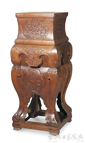 “那一场,其实好东西并不太多。有些是改制,有些材料不够讲究,有些年份比较浅,最后可以买的东西也不太多。我喊价的有两件。一件是‘明 黄花梨雕草龙纹联二橱’,还有一件是跟马未都先生竞投的那个黄花梨带托泥方台座。那个大座,从稀有性来讲,是全世界黄花梨家具木作中很有代表的一件作品。从工艺和材料来讲,它也是很有特色的。在当时的1995年,一件家具拍到七八十万人民币,是一个天价中的天价。所以在现场,我举到70多万的时候,其实已经造成了很大的轰动。举到70万以后,我们觉得如果再举的话,可能在国内会变成一个新闻事件,也怕相关单位会特别注意,所以就不敢再举下去。最后是马未都先生举到底,收入囊中,加上佣金成交价为88万人民币。其实他买到,我也很开心。让价格来证明那件东西,实际上是有价值的。那也是他早期上手的很好的一件东西。”