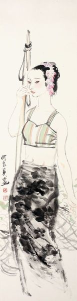 何家英对女性是具有一种特殊而强烈的表达欲望的。他认为女人是神圣的。他将对女人的感受、理解和爱转向了审美。他笔下的女性已经超越了本身的表达上,而转向了生命的美和生命的神圣。在何家英的作品中,温婉的女性常常带有忧伤的深情,因为何家英自己觉得婉约和哀伤的东西是最能骚动人心的。