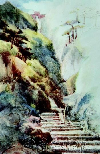 终于登上山顶,艾米丽发现这片相对平坦的台地上有几间茅草房,很像是到了苏格兰。山顶有几座庙,一座是孔子的,一座是玉皇大帝的,还有一座是泰山奶奶的。立于泰山之巅,疲惫至极的艾米丽看到了从未见过的壮丽景观:“远处的山峰层峦叠嶂,无数村庄点缀于山谷间;闪闪发光的河流,像一条条玉带,蜿蜒飘逸,消失在无垠的空间……”