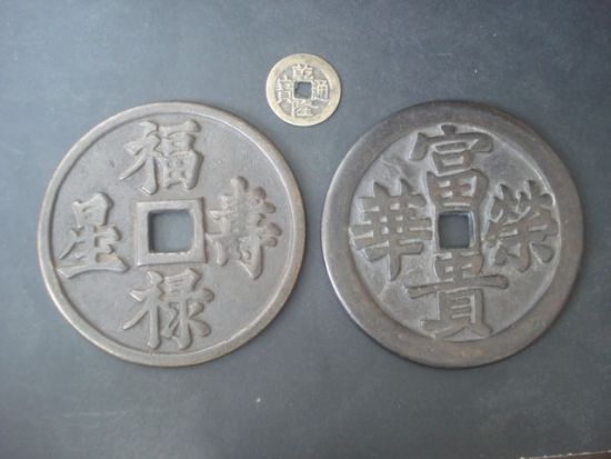 这两枚大型吉语花钱,一是大,二是少见,均为传世古。所谓大,大于80毫米以上的钱,一般都很少见,应该说,这些大型吉语花钱,可能是清中期产品,都是宫廷或富贵人家作摆设之用,常常用来预祝世代富贵荣华,永远兴旺发达,并且福禄寿三星具存。对于平民百性较难或者说也不可能享用,它与“五子登科”、“状元及第”等等吉语花钱,同属这类花钱。因此。在此贵刊一角,供读者、藏友共同鉴赏,并祝愿好人一生平安。