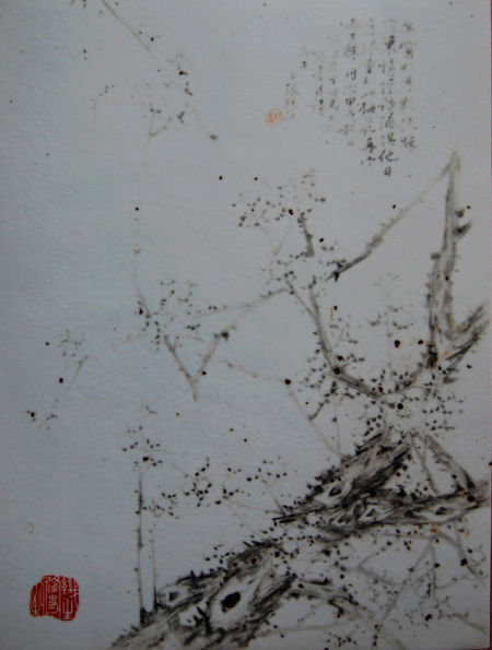 2008年,我的一位挚友从江西买回一块墨梅瓷板,当时我上手看时心潮澎湃。因友人特别喜欢不肯割爱,心中便留下了深深的惆怅,梅花的影子也时常浮现在眼前。后来,此板被一位同样倾心的朋友收入囊中,几年中,我不断地向朋友问起这块板子,经过不懈的努力,这块日思夜想的墨梅瓷板终于来到我的家中。