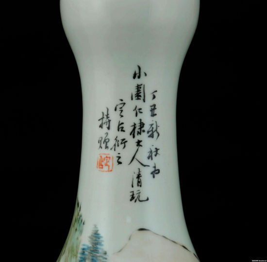 瓷板的赠送者张锡祜无从查考,而受赠者黄定占在浅绛彩瓷收藏界,是一个熟悉而神秘的官员。黄衍之,字定占,从司马大人的称呼看,应为四品官员。定占黄衍之的名字频频出现在金品卿、王少维、徐照等人的作品之上。金品卿在一个题款为“与尔同销万古愁”的墨彩大瓶和一件“渔樵问答”瓷板上均称其为定占一兄大人,口气极为谦恭。在一对赠送给饶州司马海帆大人的瓷板上,其中一块赠送者落款为“如兄定占”,而这对瓷板由王少维绘画、王凤池题款,表明海帆大人、黄衍之、王凤池这三位官员和御厂画师王少维四人的关系也非常密切。黄衍之赠送甲农大人的瓷板明确写明作于珠山官厂,和另一件赠送小园仁棣大人的蒜头瓶(图4、5)都为典型的金品卿风格,一件赠送给品珊观察大人的品锅为王少维风格。这些都表明,黄衍之很可能是御窑厂的一个官员,其地位要高于身为御窑厂督捕的唐基桐。据衡水藏友李永志考证,黄衍之为江西九江修水人,这块梅花瓷板便出自江西九江白水湖畔的村庄。目前,虽无文献资料考证黄衍之的身份,但仅凭其和金品卿、王少维的关系,和有其名字的浅绛彩瓷的精美,就已经在浅绛瓷坛留下了无数的遐想。晚清在景德镇供职的官员很多,但有几人能让后人耳熟能详?王凤池是一个,唐基桐也是一个,黄衍之无疑也是一个,这已经够了。