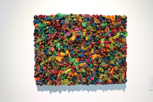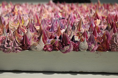 “天下”则是一系列让人五色目迷的密集奶油花,用油画颜料放在奶油裱花袋里挤制而成——草莓红、葡萄紫、菠萝黄、抹茶绿、牛奶白、巧克力黑……这些令人口舌生津垂涎欲滴的食物色泽与奶油花形,搅拌融合在巴洛克风格的雕花丛林里,因尺寸的夸张而呈现出一种过分的密集与过度的狂欢。“奶油”由此而成为一种意象,既滑腻甜美,又仿佛是对一场嘉年华或繁荣城市的高空俯瞰与微观模拟。