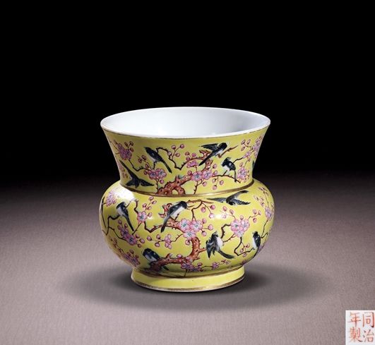 清同治 黄地粉彩喜鹊登梅纹渣斗