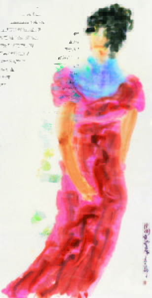 王清州的近作较之之前的作品又有了新的变化,过去很少描绘人物的他开始在画作中加入人物形象。提到彩墨的人物,我们很容易想到的是黄胄之类的民族风十足的作品,不知为何代入人物的彩墨作品,总会给人一种质朴、民族的感受。王清州的人物却与之有着根本区别,他的人物形象并不明朗。比如《傣族女孩》中,占据整幅画面的少女却只有大概轮廓,没有太多的细节,飘飘然的脱俗,在大片浓色的映掩下,有点虚幻,有些动人,允许猜测,但又有摸不透的情怀,精彩万分。