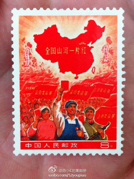 据悉,“全国山河一片红”邮票当时计划印制3400多万枚,可谓巨量!如果按正常发行,到今天也只不过是一枚价值一般的邮票。但世事如棋,由于一个意外事件,使一片红邮票的命运发生了剧变。