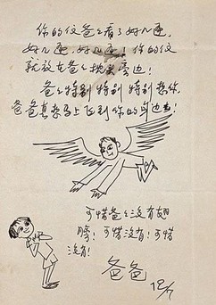 这些信几乎每一封的开头都是“小艾,爸爸特别特别地想你”,最多甚至用上七个“特别”。而丁午1969年被下放时,小艾只有8岁,为让识字不多的女儿能读懂自己的信,丁午还发挥自己的艺术特长,在每一封信中都配上了诙谐幽默的插图。这些插图都是用碳素墨水寥寥数笔勾勒而成,虽然简单,但却配合朴实浅显的文字,生动有趣地向北京的小艾讲述了自己的乡下生活以及心中难以抑制的思念之情。