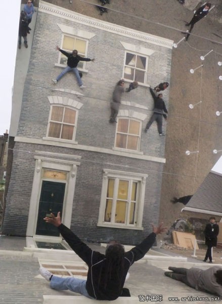 莱安德罗此次的行为艺术是在一块空地上搭建一座老式三层英式房子的外立面,其中的门窗制作精美,按实际门窗比例设计,不同的是,这一堵墙是横躺在地上的,与其呈45度角斜立着一面与墙一样大小的镜面,将地面上的墙反射到镜子里,于是奇观出现了:所有人都能飞檐走壁抑或悬空而坐……
