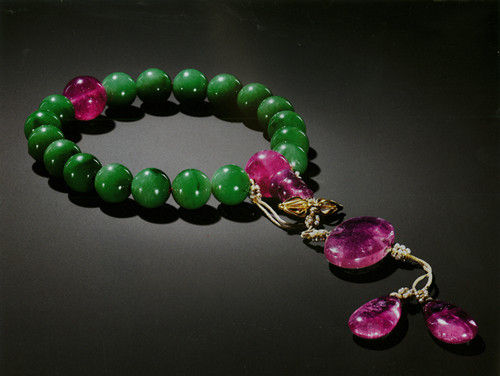 珠串类艺术品中,价值较高的首推传世数稀少的清代朝珠。朝珠的材质、式样和佩戴在清代有着严格的规定,传世品数量相当有限。2010年香港苏富比春拍,一件重330克的18世纪清宫御制东珠朝珠估价800万至1200万港币,拍至6786万港币,非普通藏家所能承受。直径较大的东珠在清代极为珍贵,制成的朝珠清代只有帝后使用,和珅富可敌国,抄家也仅发现一件东珠朝珠。