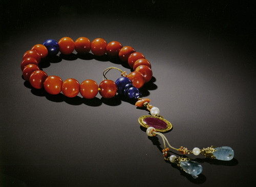 考古出土的串饰没有固定的穿饰物数量,但是到了清代,朝珠和手串使用的珠子数量有一定的要求。清宫旧藏手串多为“十八子”手串,朝珠为108颗珠子组成。手串、朝珠源自佛教的数珠,数珠也称念珠、佛珠,是佛教信徒念佛经时记数目的用具,《佛说木患子经》中记载以无患子的圆形果实穿成,后来流行的菩提子之说,其实是Tilia miguelana树的果子,人们称为菩提树。现今到处流传的菩提子,其实是那此用来制作数珠的很多不知名的质地较坚硬的果实。随着汉代佛教净土宗、密宗兴盛,数珠大量流行。清代把玩手串盛行,和珅被嘉庆帝赐死抄家,仅珍珠手串即达二百余件。
