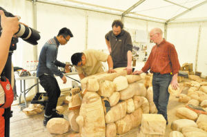 木艺合作的最后一道程序,就是把艺术家们创作的“石块”与小件,垒砌成一道长约6米、高约1米的墙。这道工序暴露出了钢筋水泥建筑文化中成长的尴尬由于石块形状接近椭圆,艺术家们曾经试想竖着叠垒,被王向东劝阻,“这样石块底部接触面积少,不稳定,容易坍塌。”于是改为横放,却又因找不到规律而一次次失败。
