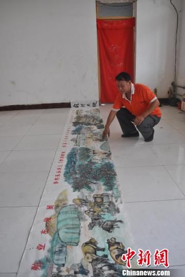 季金章展示长达9米的国画《农村天地》。苗凤强 摄