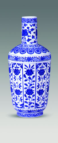 清乾隆·青花串枝花卉纹棒槌瓶尺 寸:高30.9厘米,口径4.6厘米,足径8.3厘米鉴赏要点:造型似旧时糊纸袋压折印所用的工具,故又称“纸槌瓶”,康熙、乾隆时期比较流行。内壁施白釉。口沿、肩部和圈足都绘有卷草纹相互呼应,但肩部略有变化,纹样较简单,并且与莲瓣纹装饰带配用。颈部与腹部的花卉纹也相互对应,颈部饰缠枝纹,腹部主体纹饰为串枝纹。