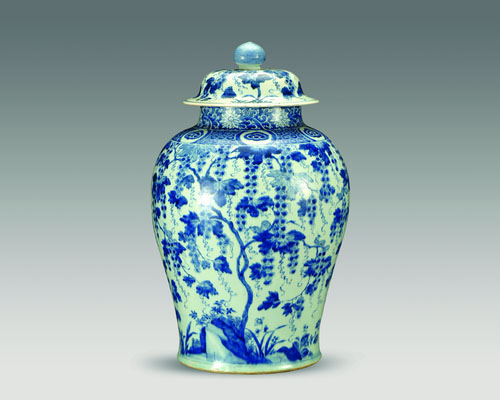 清康熙·青花葡萄纹将军罐 尺 寸:高69.5厘米,口径19厘米,底径26厘米鉴赏要点:1960年湖北荆州城南郊御河村出土,湖北荆州博物馆藏。