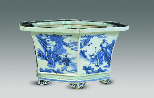 清康熙·青花人物纹花盆尺 寸:高19.2厘米,最宽37厘米鉴赏要点:南京博物院收藏。这种六方花口造型的花盆于清康熙时期最多。胎体比较厚重。折角处及足端外沿皆起阳线,古瓷中花式造型的折沿花盆,转角处都是如此做法。此盆为平砂底,底部有一只约2厘米的小洞。沿面绘竹叶、灵芝、松树段装饰带,腹部六面分别绘福——童子手捧寿桃,禄——长者身后站着一只鹿,寿三星纹。内壁半釉,下部施釉淋漓。此花盆棱角、转折处的做工也利落干净,极有力度。