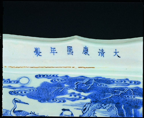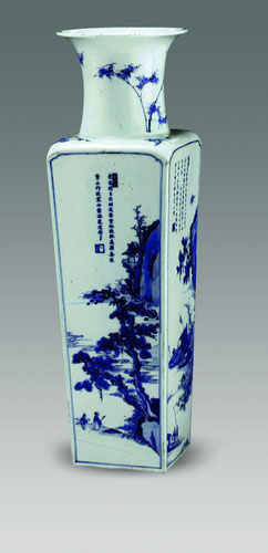 清康熙·青花山水图方瓶(底有伪托款)尺 寸:高54厘米,口径16厘米,底宽11.8厘米鉴赏要点:上海博物馆收藏。采自《上海博物馆和英国巴特勒家族所藏十七世纪景德镇瓷器》100号。瓶的颈部为圆形,腹部呈方形。肩部四角圆浑,使得瓶子的整体造型和谐统一。腹部四面分别绘四幅山水图,皆有题诗,并绘“木石居”印章款,为作坊名。底款是伪托款,据上海博物馆周丽丽女士考证,瓶子的制作时代应该为17世纪90年代。