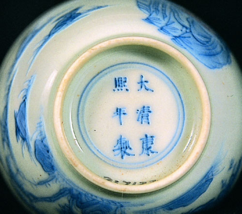 清康熙·青花人物盅尺 寸:高5.1厘米,口径7.2厘米,足径3.3厘米鉴赏要点:此杯的胎体轻薄。口沿有一道薄薄的唇边。青花发色较淡雅,混水均匀。它的一侧绘两位着汉代服饰的高士执手相谈,另一侧绘着数只卧羊。清代早期的官窑瓷器中,像这样在小酒杯上绘人物纹样的,十分少见。