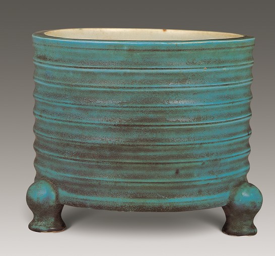 全器以七道双凸弦纹为饰,外罩孔雀绿釉,内白釉微泛青,有黑疵斑点,足部积釉处呈色深蓝,足底无釉,孔雀