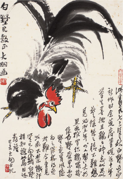 众所周知,余白墅先生为人正直、待人谦和,即使在自己遭遇不公正的情况下,也不会对别人落井下石。而2013西泠春拍“隐墅居藏中国书画作品专场”的一件由著名写意花鸟画家陈大羽所作的《雄鸡图》就很能诠释余先生刚正不阿的品质和待人接物的准则,画中一只“大公鸡”神态生动雄劲,画风苍劲有力。在“文革”批黑画时,陈大羽先生的公鸡也不幸被扣上一大堆政治帽子,诸如“怒气冲冲的大公鸡”、“尾巴翘上天上去了”、“对社会主义的极端仇视”等等骇人听闻的罪名,并被社会大加挞伐。当时也有人煽动余白墅先生出来揭批,但余先生不仅“装聋作哑”,还把“大公鸡”偷偷藏好。粉碎“四人帮”后,当老朋友们劫后余生,欢聚一堂之时,余先生把自己收藏的“大公鸡”向大家展示,大羽先生触景生情,握笔蘸墨,欣然疾书,用文字在此画上写下了这段经历,从而使这件作品变得更有意义。