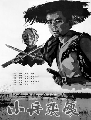 1963年,我们放映《小兵张嘎》,观众深深被电影中的嘎子所吸引。该片的海报构图比较简单,最为突出的是主人公张嘎,只见他紧锁眉头,双目怒视。嘎子头顶破烂的草帽,还用花包袱背着随身用的物品,完全是一副“小大人”的模样。他腰间系着宽宽的军用皮带,手中紧握一把枪。孤苦幼小的孩子为了复仇而背井离乡追随革命队伍,这种力量正是中华民族取得抗日战争最终胜利的重要原因之一。画面中刻画了嘎子的奶奶为了掩护八路军被日寇抓住后,雪亮的刺刀架在脖子上英勇就义的情景。老奶奶目光镇定、大义凛然,表现了中国人民视死如归、坚强不屈的民族性格;画面下端的图景表现了影片故事发生的地理环境以及当地的自然风貌,白洋淀、芦苇荡、雁翎队,使海报的构图沉稳、结构均衡。海报的作者是著名的美术家江平。