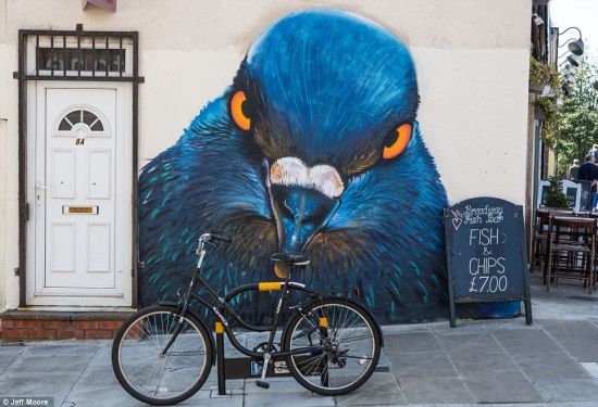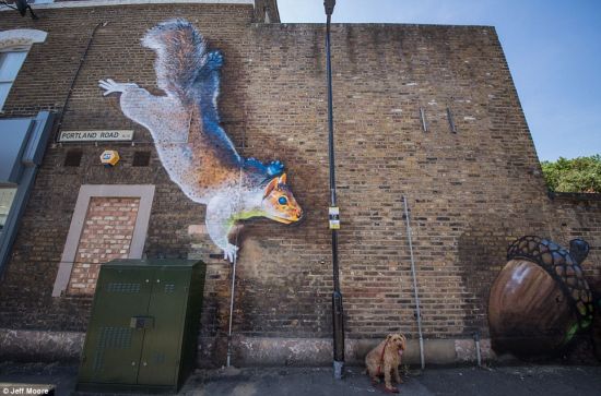 他们已经完成的画作,包括伦敦场地的巨型蓝色鸽子,哈林盖区的大狐狸,和托特纳姆的超大尺寸松鼠、坚果。