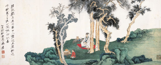 二十世纪三十年代,大师痴迷于青绿山水,他批阅古今,上下求索,广学博取于文征明、仇英等人,深入研习其笔法气韵,在继承传统的基础上大胆突破,恢复了青绿艺术的创新功能。还有哪种画法比青绿更能描绘春山的妩媚呢?在《春日品茗图》中,画家用石青、石绿绿写苍翠嶙峋的山坡磊石、翠色欲滴的离离春草,使观画者如踏青茵,如沐春风,春茗青涩的香味仿佛扑面而来。而高士身下之席与童子上襦均为红色,与青葱相对,浓丽鲜雅,艳而不俗。