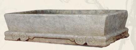 明·青白石如意足长方形石盆,藏品用材考究,周身淡雅,器形规矩完整,造型简练,线条流畅,典雅大气。不追求过多的工艺修饰,简约中彰显著明式的曲线之美,含蓄中又将皇室格调与品位一一展现。素盆一只,呈现出皇家高雅精致的高质量格调与需求,又代表着明代对于艺术的理解和生活的追求,极具儒雅风韵和文人气质,石盆方正之间,反映出拥有者不平凡的身份和地位,格调和品位也可见一斑。