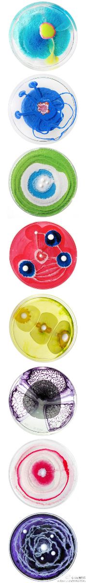 “The Daily Dish”是她的一个持续一年的艺术项目,她去建材市场买来的各种粉末和工业颜料,在培养皿里每天完成一件作品,并贴在她的博客上。这意味着,一共有365件不同的作品会呈现在大家面前,这些作品极尽绚丽,每一天仿佛都会涌出一种新的可能。