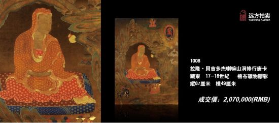 古代唐卡专场是远方拍卖在北京地区竖起的一支标杆性拍卖活动,早在去年秋季首拍就引起了业界的强烈关注,至此第二场依然是风头强劲,吸引了大批不辞辛劳远道而来的海内外藏友。开拍之始,现场一度座无虚席,人头攒动,十分热闹。在这场拍卖活动中,一幅17-18世纪的《拉隆·贝吉多杰山洞修行》唐卡尤其吸引了众人的目光,其绘制精良,敷色沉稳,将主尊拉隆·贝吉多杰喇嘛在一山洞端坐修行场景精心的描绘出来,充分展现了噶玛噶孜画派的艺术特色与水平,也展现了噶玛噶孜画派的艺术风采和魅力。属于噶玛噶孜画派中的宫廷画派作品。极为难得。此幅唐卡在短短几分钟的竞价中,最终被一位神秘买家以207万元的高价购得,不由使人热议。除此之外,唐卡中的《莲花生与大成就者》唐卡、《狮吼观音》唐卡均以75.9万的价格拍出,而《松赞干布》唐卡、《大宝法王得银协巴》唐卡则分别以71.3万元和69万元的价格拍出,还如《噶举派诸护法》小唐卡(一套22幅)和《三世章嘉活佛》唐卡则以62.1万元和57.5万元的价格拍出,在拍卖现场,竞投号牌频频闪现,掌声此起彼伏,场面气氛热烈。