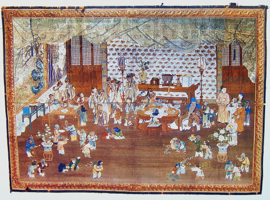 长3.66米,宽2.67米,故宫[微博]博物院收藏。挂毯的构图以写实的手法描绘了古人最为常见的合家欢聚过新年的情景:一座宽敞的庭堂中牡丹盛开,案上摆放着觥、炉、提匣、如意,瓷瓶里插有松枝,案前圆桌上摆放着新年干鲜果盒,年味十足;庭堂中的人物则个个神采灵动,整幅画面体现了“一家多富贵,荣华降吉祥”的美好景象。挂毯的范本极可能是乾隆时期的宫廷画师姚文翰的手笔,与姚的《岁朝欢庆图》画法与风格极为相像。