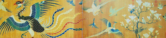 凤凰本是传说中的神鸟,见之则天下安宁,所以历来为皇家后宫专用,有凤仪天下之说。画面中蓝凤的丹凤眼环视四周,凤颈上斑纹点点,凤背鳞纹突兀,凤凰体型大,造型优美,扇形羽翎展开,长长的凤尾拖曳其后,两足一伸一屈,俨然正在展翅回首之际,而白凤正盘旋俯冲下来,呈张口鸣叫之势,与蓝凤上下呼应。这幅织成凤仪图,织工娴熟地运用各色金彩纬线通梭提花技术织就玉兰与凤鸟,再以拈金线织制鸟、花的框边,使得整个画面精工匀整,富丽光艳,可见元代的织工已经具备了织技、色彩和纹饰三者相结合的高超技艺。如此大幅的织成宋锦,不仅是研究元代织锦技术的重要实物资料,也是传世织成锦中的稀世珍品,举世仅此一幅。