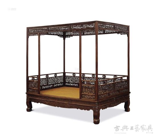 黄花梨有束腰三弯腿螭龙纹六柱式架子床 清早期