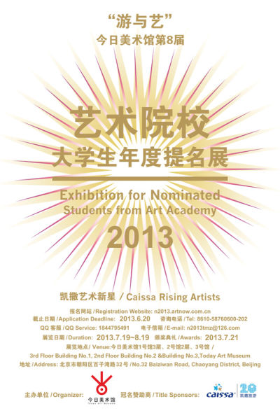 2013 年7 月19 日至8 月19 日2013 艺术院校大学生年度提名展,将于今日美术馆1号馆3 层,2 号馆2 层,3 号馆1、2 层展出。7 月21 日将在今日美术馆广场举行隆重的颁奖典礼。本年度大学生提名展真诚地希望能够为年轻的参展者们带来全新的视角和灵感,共同经历一次美妙的创作之旅。