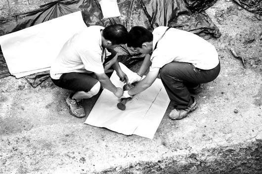 随州叶家山一带断断续续出现小雨。记者在现场看到,待挖掘的墓葬上都盖好了塑料纸。在最后的有待发掘的两座M111和M28号墓中,塑料纸上都有积水。考古队员先是用小桶将积水舀到大桶中,再用吊车将水转移出来,才开始清理二层台上的文物。