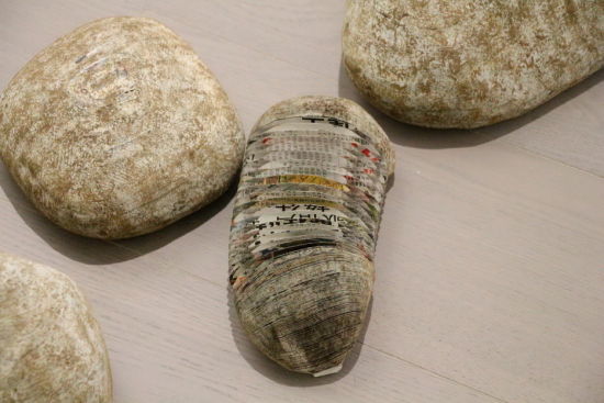 而年轻一代艺术家的作品不仅有想法,而且显示了令人赞叹的技术和耐心。比如从中央美术学院[微博]毕业不久的李洪波,他的作品《一棵树& 石涛》不太起眼,就是放在地上的几颗“石头”和一根“树枝”。它们都是用纸做的,但是太过逼真,不单单是颜色和纹理,连摸起来的手感也具有欺骗性,只有重量出卖了它们。把树枝拉开一点,会发现相当于枝干横截面的纸一张连着一张,形成类似蜂巢的结构,所有纸的厚度叠加起来,就是树枝的高度。要制作那么大一根树枝,且不说技术难度,光是没完没了的重复劳动就不是一般人能胜任的。这组作品不把概念作为旗帜来招摇,也没有任何故弄玄虚的对自然之物的模仿,无疑是“意象”展中最让人感动的“当代艺术”。