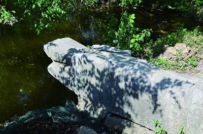 昨天上午,记者在村东水塘闸坝上看到,长约2.6米的石龙横在坝上,龙头栩栩如生,石龙身上有石刻鳞片。今年61岁的杨竹生是村民组长,他介绍,石龙是上世纪70年代从村中一个大土墩上发现后,运来建闸坝的,当时运来的石龙有2尊,另外一尊埋在这尊下面,眼下被泥沙掩埋,看不到了。