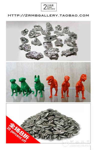 “2元画廊”是以极低价格进行艺术品销售的小店,也是将艺术生产、展览、销售“一体化”了的“概念画廊”。“2元画廊”中售卖的作品由戏仿艺术界流行作品中的典型性符号所构成,现已研发五类作品:瓜子、假山石、绿狗、恐龙、蝴蝶。“2元画廊”的作品可寄居于各类社会活动与展览中进行展示与销售。