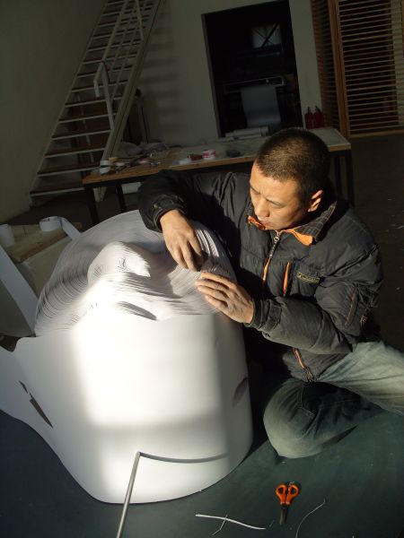 李红军:纸材属于薄质材料,传统剪纸的语言主要集中体现在单张纸材的平面造型之中,而我选择的是用薄质纸材的叠加寻求立体造型变化的可能性。除了立体写实造型之外,更重要的是形象的变化,从表面上来看使用分层累加的语言方式,本身就是一件取短弃长的选择。这种选择使最能体现纸材的巧性的对折、复数性等纸材语言优越性无法在制作中使用,利用最薄的材料堆砌一个形象,这可能看起来是十分愚蠢的作法。人们把艺术的制作方法称为技巧,而“巧”、“以少胜多”、“四两拨千斤”是体现艺术家的能力、智慧和作品艺术性的一个标准或者重要因素。我在材料语言的选择上,弃长取短,技术上的弃巧取拙,制作工序上的弃简取繁,并不是一个自觉地逆向选择,而是寻求立体写实追求形象变化的基本要求。但客观上这就是我的艺术观念和思想方法。用分层叠加的方法实现立体形象的造型,只有在一张张薄纸叠加出具有一定体积的材料中,实施雕刻,通过纸片的抽取与移动来实现立体的造型的变化。分层叠加方法的选择,本身就预示着作品一旦进入制作阶段,就要面对巨大的工作量,承受很大的工作强度。一件作品大约有2000多层,首先要剖切原始形象,然后逐层雕刻,再以更大的工作量擦去每一层边缘的灰尘,最后再分层构建新的形象的变化。巨大的工作量不仅是构成新艺术语言结构的必须过程,而且从中折射出的劳动精神,也是作品必定要透露出来的信息。如果说在观看时,劳动量是被暂时遮蔽的话,那可能是由于薄质的白色纸模糊了过于细密的纸层微妙的大小变化,而材料新语言的独特性强制地使视觉形象成为了视觉的焦点,从而掩盖了巨大的劳动量,使得作品的创造性得到最大的凸显。