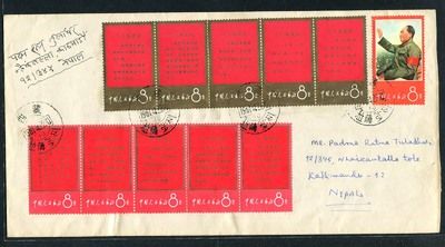 1967年4月29日西藏拉萨实寄尼泊尔封,此封正面贴文1毛泽东思想全套。文1毛泽东思想万岁原定于1967年5月1日发行,后因为了庆祝北京市革命委员会成,决定提前发行。因此文1发行时间为1967年6月20日,此件实寄封销拉萨4月29日戳比发行日期晚了9天,属较早使用,具有一定的收藏价值。