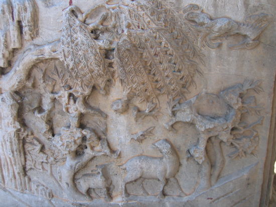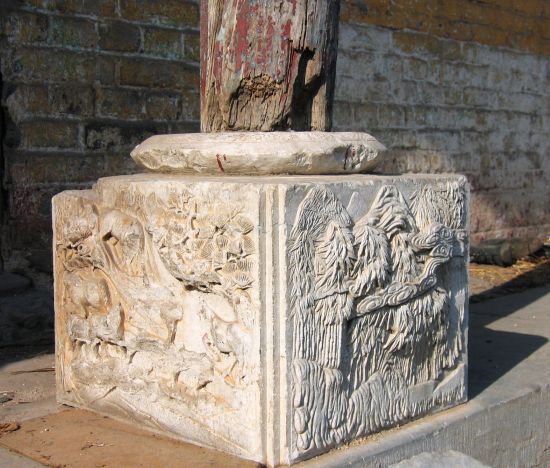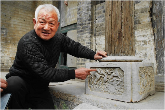 现在,大院仅剩8处古房楼,计38间,夹杂在后来陆续兴建起的平庸小瓦房中,古朴的建筑显得颓废和衰败。有些建筑被多次改造,已失却了原来的模样,唯东西两处客屋还保留着昔日的庄重、典雅和古朴。西客屋原有东西厢房相配,构成独立的院落。客屋高约6米,正面建有廓道,飞檐翘脊,气度庄穆,颇有孔府建筑风格。客屋屋顶用青灰色的弧形瓦上凸而饰,饰有五脊六兽。屋宇下的滴水檐瓦为桃形,饰有精美的花纹,雅致地做了屋面的结尾。廓道上挺拔的抱柱,1米半高的底段已褪去了朱红颜色。托起抱柱的是一块汉白玉石雕琢成的石鼓,石鼓上部呈圆形,与抱柱等径相吻,下部是四面刻有不同图案的石礅。拂去岁月的尘埃,展现在眼前的竟是鲁南罕有的汉白玉石雕艺术品。石礅南面雕刻有“荷莲图”,图案内容为秋莲抱子、翠鸟啄食;石礅东面刻的是柳树下3只形态各异的小羊,取“三阳开泰”之意;石礅北面雕有竹、梅、喜鹊,呈“喜鹊闹梅”之意:西面雕的是松下五鹿,希翼“五禄呈祥”的瑞气。