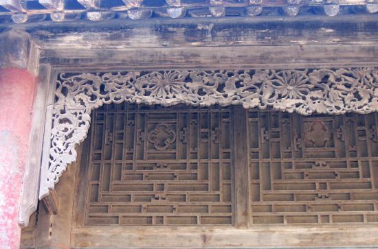 走进屋内,空徒四壁,屋内地面上的4块顶柱石皆用上等青石雕刻的仰卧磐龙礅,龙头已经毁坏,但龙身还活灵活现。抬头上望,唯见托起屋面的两东西梁架,梁架均托五檩,用料粗细有别,岁月的烟火已熏黑了它本来的面目。东西底梁下部还各悬有一对龙形铁钩,为挂灯之处。北三檩中部钉有两个楔形木块,这是挂匾的地方。楔形木块上雕有倒头蝙蝠,喻“福”到之意。客屋原来有南北内门,关起内门可成内屋。据说,每有孔府来人或家商大事,客屋内门才开启。
