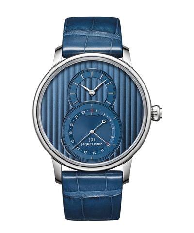 1785年,雅克德罗首创灵感来自数字8的Grande Seconde表盘,此设计在怀表上获得巨大成功之后又在腕表上延续着古典的风情。但今年的Grande Seconde Qantième做出了较大的突破,蓝色的日内瓦条纹表盘取代了白色大明火珐琅盘,巴顿式时标取代了先前的阿拉伯数字和罗马数字。