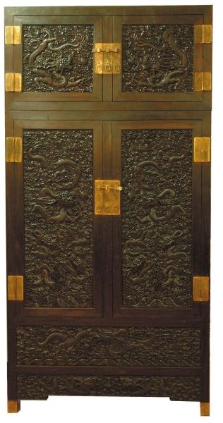 一遍遍的仔细擦洗后,之前被土所模糊了的深紫褐色柜身便显现出来,只见正面的柜门、闷仓和柜身两侧全部以浮雕的手法饰上海水云龙纹,线条流畅,磨工精巧,其中霸气的龙纹我相信是皇家精品上才有的。遗憾的是,底柜里四个闷仓盖儿遗失了。这柜子我买回来时原是完好无缺的,大概是寄存于阁楼时被人取走。于我而言,藏品往往不只是一件器物,更像是一个需要呵护爱惜的孩子,不忍看着原来完整的柜子有所缺损,我于是花了三年时间才找到了合适的檀香木进行修配。新配的盖儿做工精良,普通人很难看出与原柜体的差异。后来,我请专家鉴定,原是一对紫檀龙纹顶竖柜,属清末或民国初期的上乘家具。