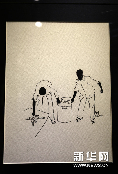 这是苏宁个人画展上展出的画作《抬汽水的人》(8月6日摄)。新华网图片 杨世超