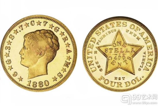 1880年制造的4美元斯特拉盘发浮雕金币,现在估计可拍得100—150万美元(约合人民币612—918万元)